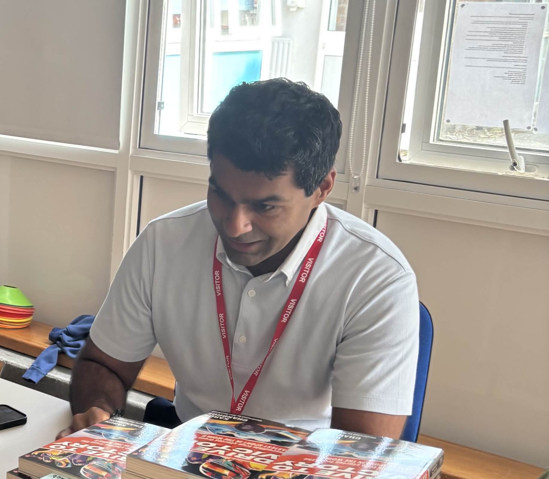 Adding to the excitement, a generous parent kindly loaned a detailed model Formula 1 car for display during the visit, giving pupils a close-up look at the sleek design and engineering behind the sport. Karun also took the time to personally sign copies of his book for the children, leaving them with a treasured keepsake from a truly memorable day.